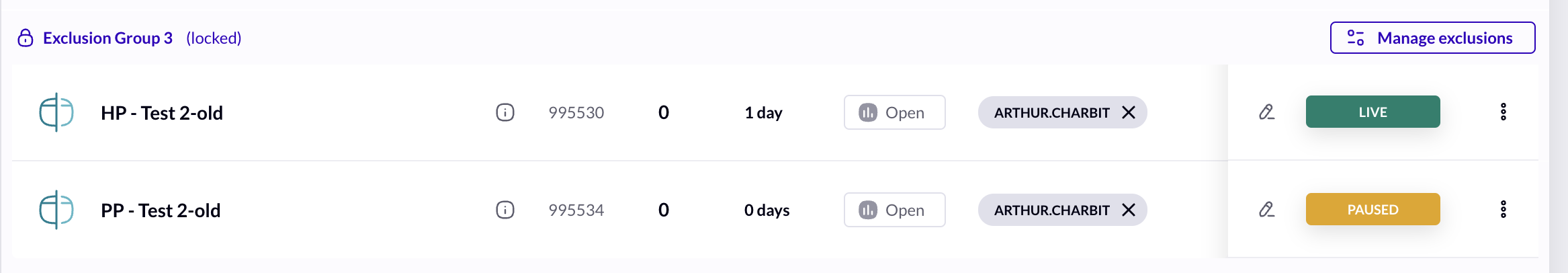 An exclusion group remains unlocked until at least one of its campaigns is live. While unlocked, you can: